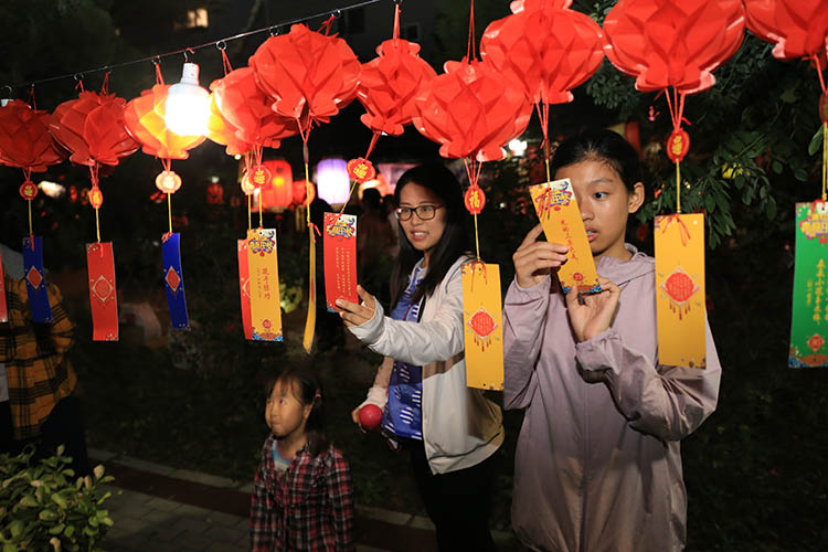 社区居民边观赏自制花灯边猜灯谜。